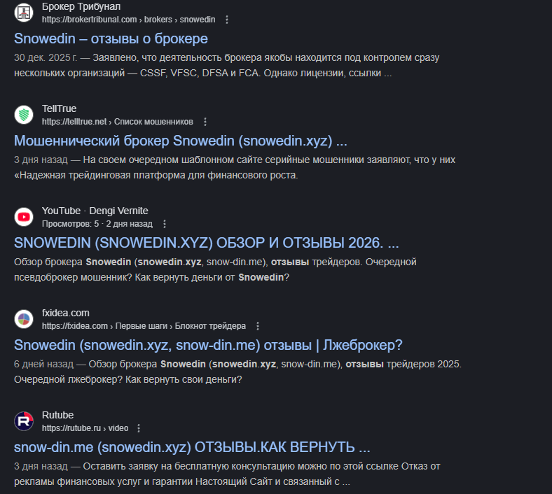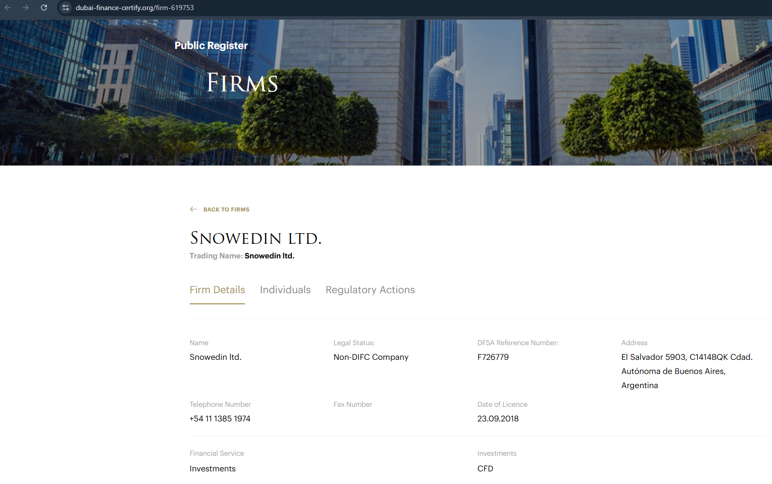Например, в настоящей базе DFSA нет никакой информации о брокере SnowEdin, что говорит об отсутствии лицензии – такая же ситуация и с другими регуляторами.