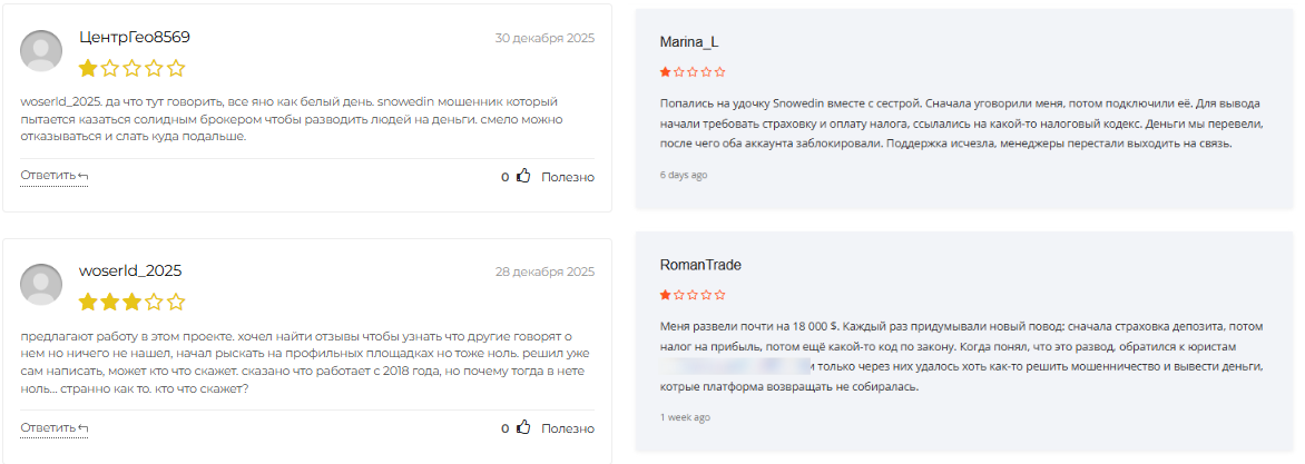 Также отзывы о SnowEdin xyz можно найти в рамках сторонних сайтов, но встречаются только негативные комментарии, что указывает на высокую степень недовольства пользователей.