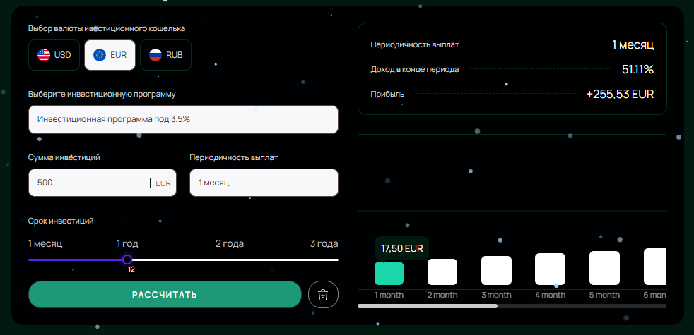 Кроме привычной торговли, на сайте доступны инвестиционные инструменты с доходностью до 51.11% годовых, что кажется более чем заманчивым. В SnowEdin депозиты принимают в нескольких валютах, а выплаты позволяют получать ежемесячно без строгих условий, чего не найти у других брокеров.