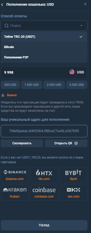 В реальности прямое пополнение не работает, так как система дает сбой и рекомендует пользователю отправить деньги в криптовалюте. Поддерживаются кошельки в сетях TRC-20 и BTC, а о комиссиях нет никакой информации – при этом непонятно, насколько быстро средства будут зачислены на счет.
