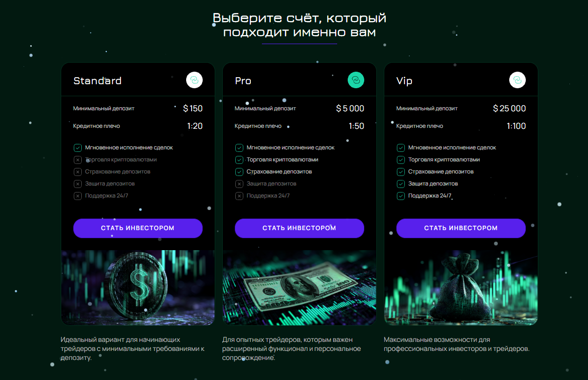 - Вип – необходимо пополнение на сумму от $25,000, что позволяет еще больше увеличить кредитное плечо, а также рассчитывать на дополнительную защиту и круглосуточную поддержку.