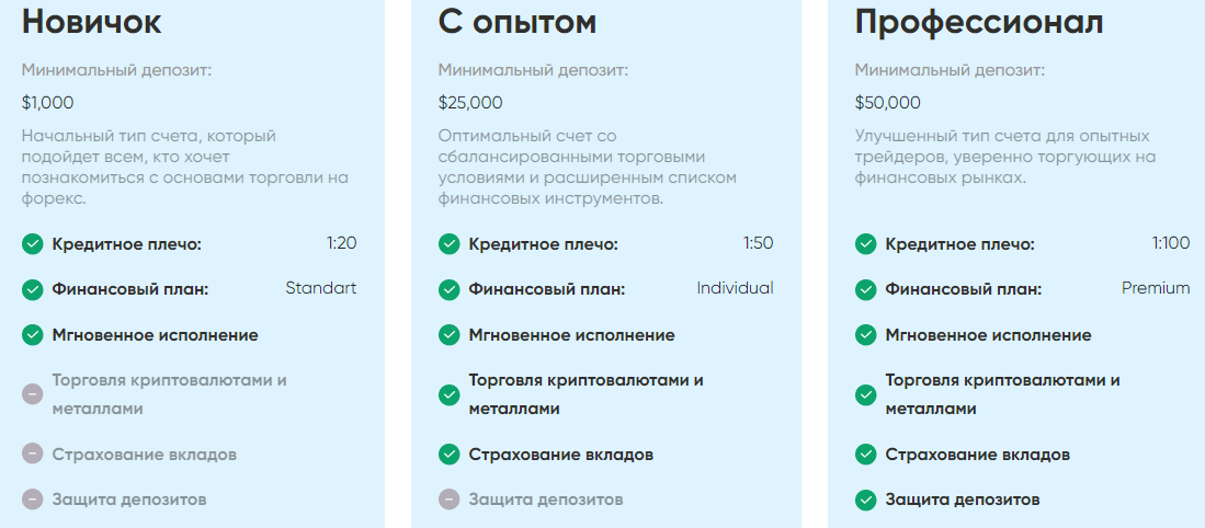 - Начальный. Депозит от 1000 долларов. Подойдет новичкам, желающим попробовать себя в торговле. Кредитное плечо — 1:20.