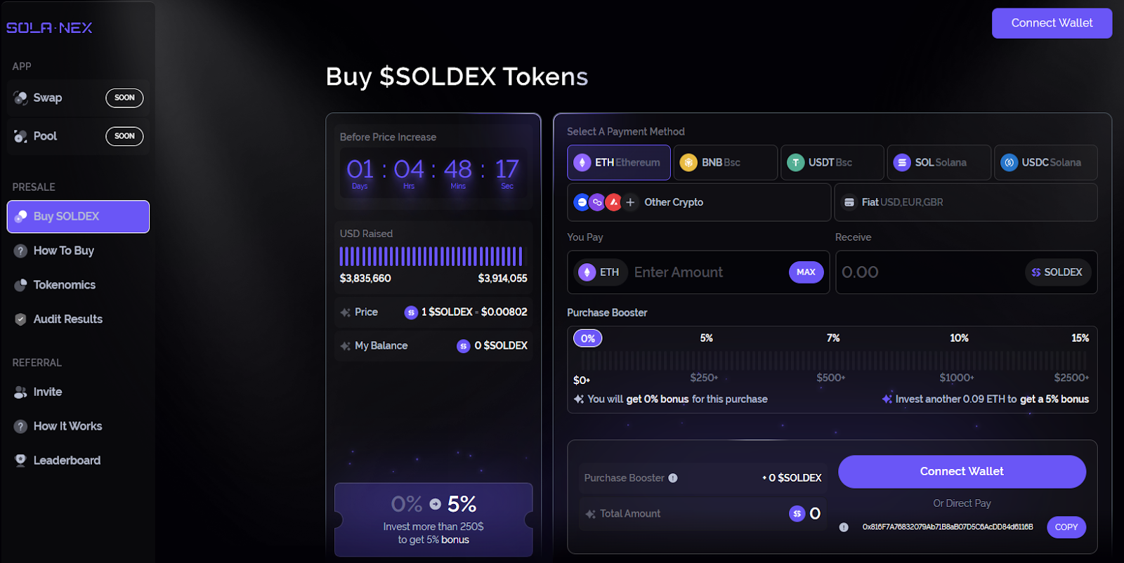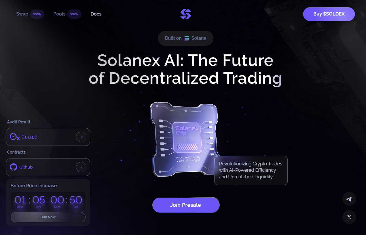 На сайте включен обратный счетчик, показывающий время до повышения цены токена. Есть возможность инвестировать в него в рамках пре-сейла. Биржа «Соланекс» функционирует на основе блокчейна Solana.