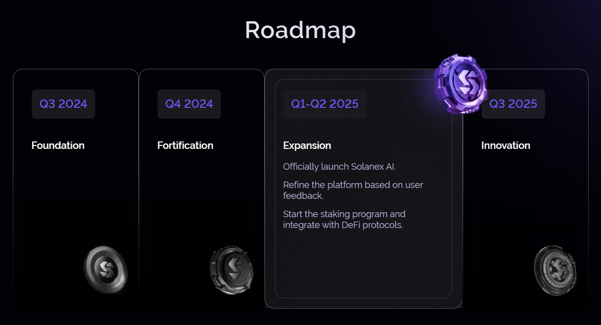 Этап расширения включает официальный запуск Solanex ai, доработку платформы с учетом рекомендаций пользователей. В него также включен запуск программы размещения ставок и интеграции с протоколами DeFi.