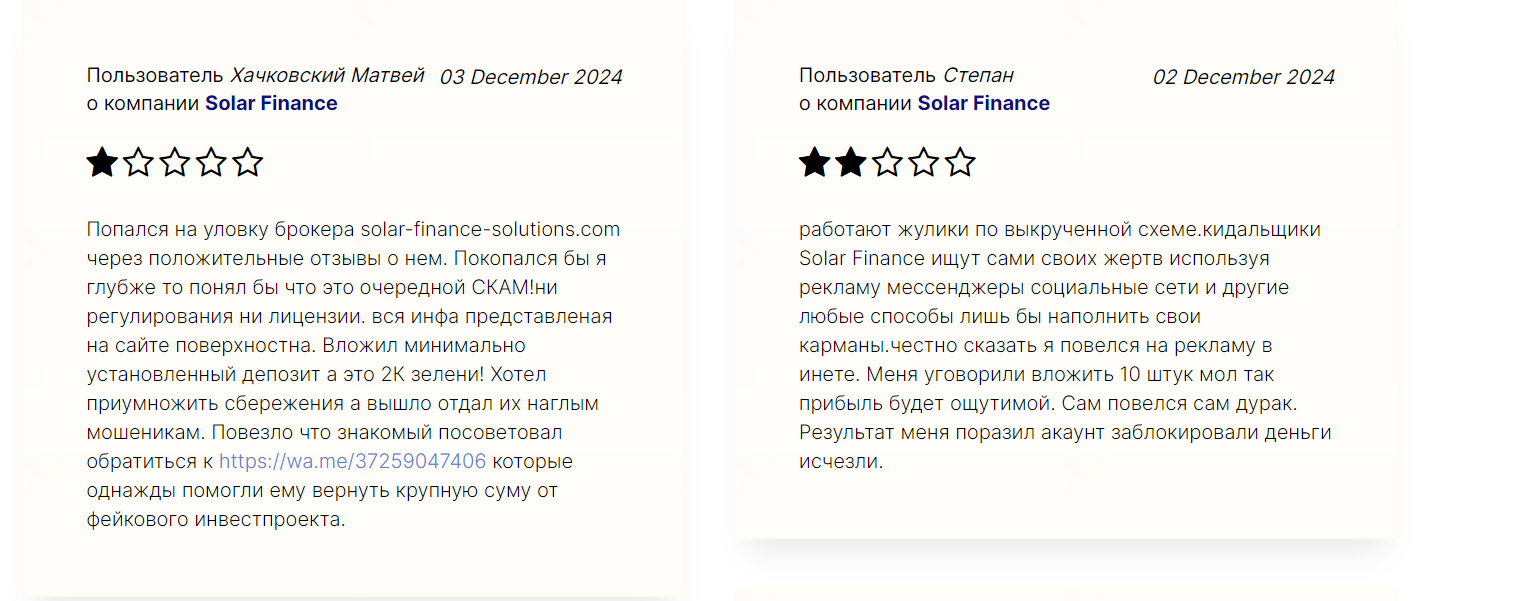 Разоблачение Solar Finance кроется в негативных отзывах клиентов об этой компании. Недовольные пользователь жалуются, что сотрудники раскручивали их на внесение крупных сумм, но все заканчивалось блокировкой аккаунта и исчезновением денег.