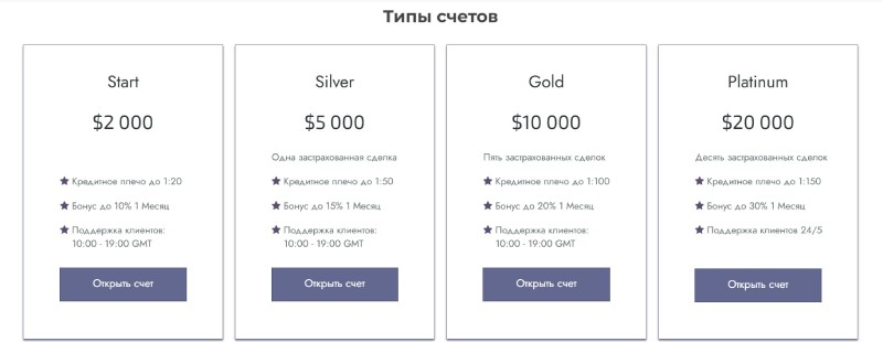 SolarFinanceSolutions предлагает своим клиентам на выбор четыре типа счетов для трейдинга. Стартовый размер депозита кошелька равен двум тысячам долларов. Пользователь может совершать сделки с кредитным плечом 1:20. Это хорошее значение, но чем больше ставка на увеличение, тем выше риск все потерять.