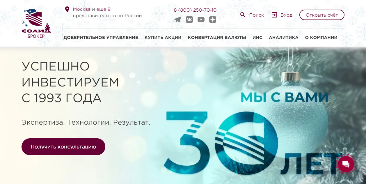 Компания Солид работает с 1993 года и является ведущим оператором Московской биржи, а также продолжает держать рейтинг надежности (НРА) как стабильная компания. Солид обещает своим клиентам помочь находить альтернативные способы увеличения капитала инвесторов, а также достигать инвестиционных целей и уметь использовать любую ситуацию на рынке в свою пользу.