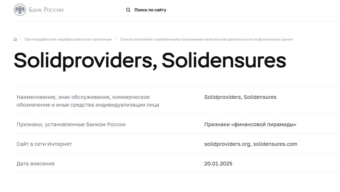20 января 2025 года Банк России выявил признаки финансовой пирамиды компаний, работающих под брендами Solidproviders и Solidensures. Соответствующие домены solidproviders.org и Solidensures com были добавлены в черный список.