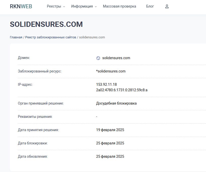 Страница Solidensures com не открывается после блокировки Роскомнадзором 25 февраля 2025 года. Решение было принято 19 февраля 2025 года, что предположительно связано с текущим судебным разбирательством.
