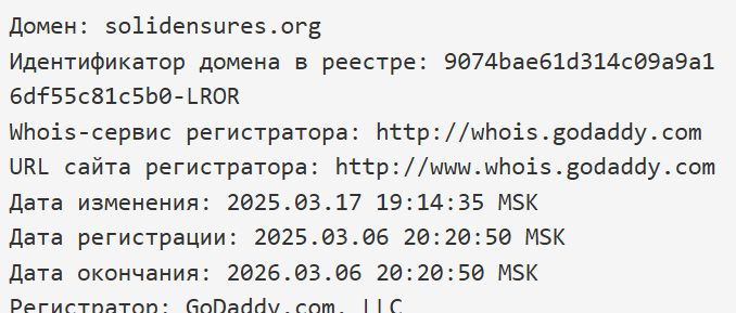 Домен Solidensures org был зарегистрирован 6 марта 2025 года, а Solidensures com – 5 февраля 2025.