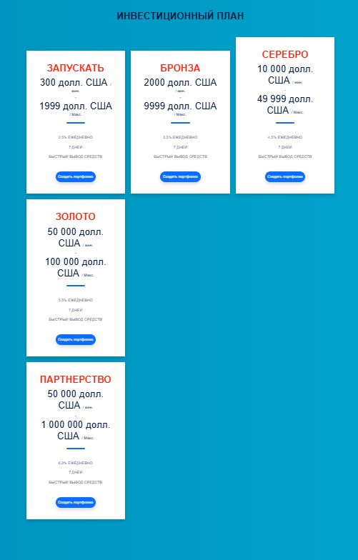 Клиентам предлагается выбрать один из инвестиционных планов с фиксированной доходностью от 2,5% до 6% в день сроком на 7 дней. Минимальный депозит – $300. Даже при таком минимальном вкладе, брокер гарантирует 17,5% прибыли за неделю. Еще один факт, который поражает тем, что достижение столь высокого показателя в обычной финансовой среде практически нереально.