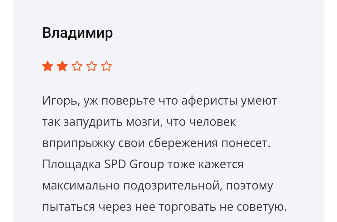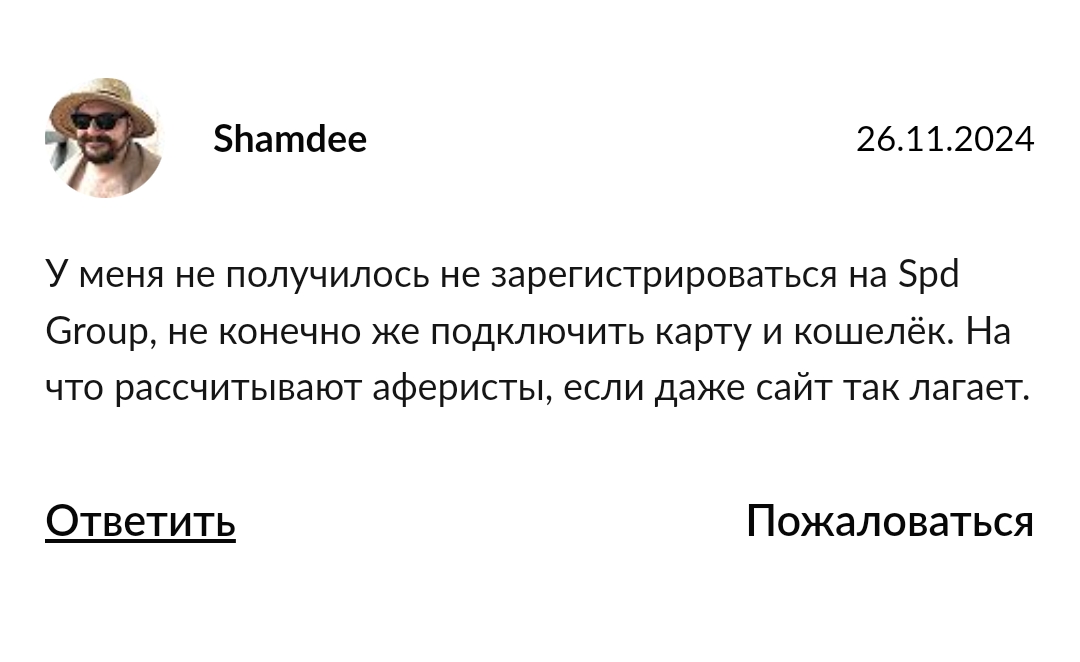 В сети можно найти много негативных отзывов о «СПД Групп». Люди пишут о проблемах с выводом средств даже небольших сумм. Часто упоминается навязчивая работа менеджеров, которые уговаривают внести дополнительные депозиты. При этом положительные комментарии выглядят подозрительно однотипными и появляются группами в одно и то же время.Особенно настораживают истории о мошенничестве, когда после нескольких успешных сделок клиентам отказывают в выводе денег под разными предлогами. Служба поддержки Spd Group в таких случаях перестает отвечать.