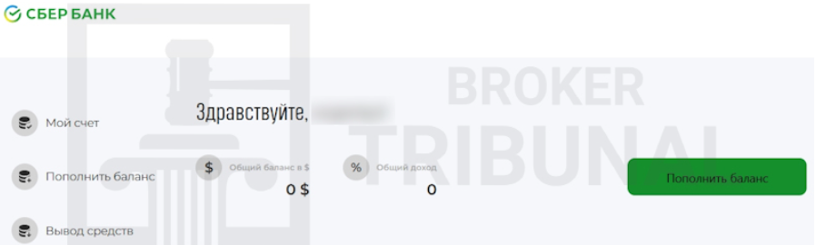 Однако нам удалось найти скриншот одного из разделов сайта. Интерфейс здесь максимально просто: есть кнопка пополнения баланса, а также отображены текущие суммы заработка. Сверху, конечно, расположено лого Сбера, который к проекту вряд ли имеет хоть малейшее отношение, далее объясним почему.