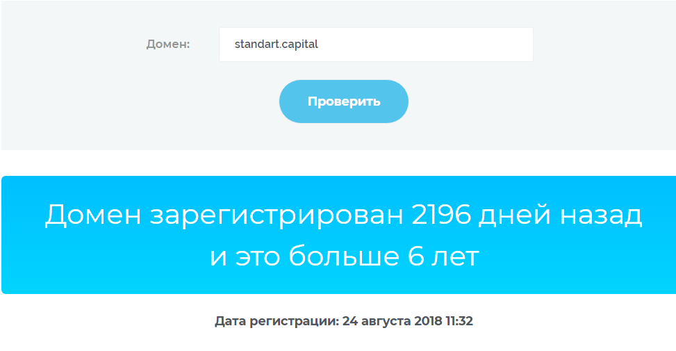 На сайте указано, что компания была основана еще в 2017 году, но в сети указано, что ООО “Стандарт капитал” зарегистрирована 12 ноября 2018 года, а домен standart capital, по данным сервиса проверки доменов, существует с 24 августа 2018 года, что свидетельствует о недействительной информации на сайте брокера.