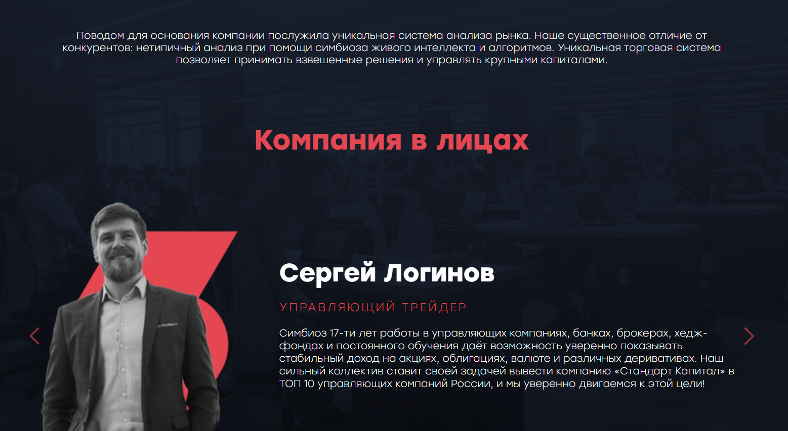 Без регистрации аккаунта невозможно и ознакомиться с терминалом и информацией о торговли на Standart Capital. Зато предоставлена информация о сотрудниках. Например, Сергей Логинов – управляющий трейдер, который за 17 лет работы в экономических организациях научился формировать инвестиционный портфель и обеспечивать постоянный доход на разных активах, а также выявил собственную стратегию анализа, которая спровоцировала начать проект “Стандарт капитал”.