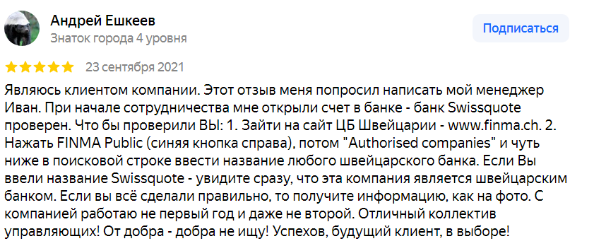 Ольга оставила отзыв, в котором рассказала, что сотрудники предлагают заключить сделку и для этого звонят и надоедают рассказами о своем партнере – швейцарском банке Swissquote.