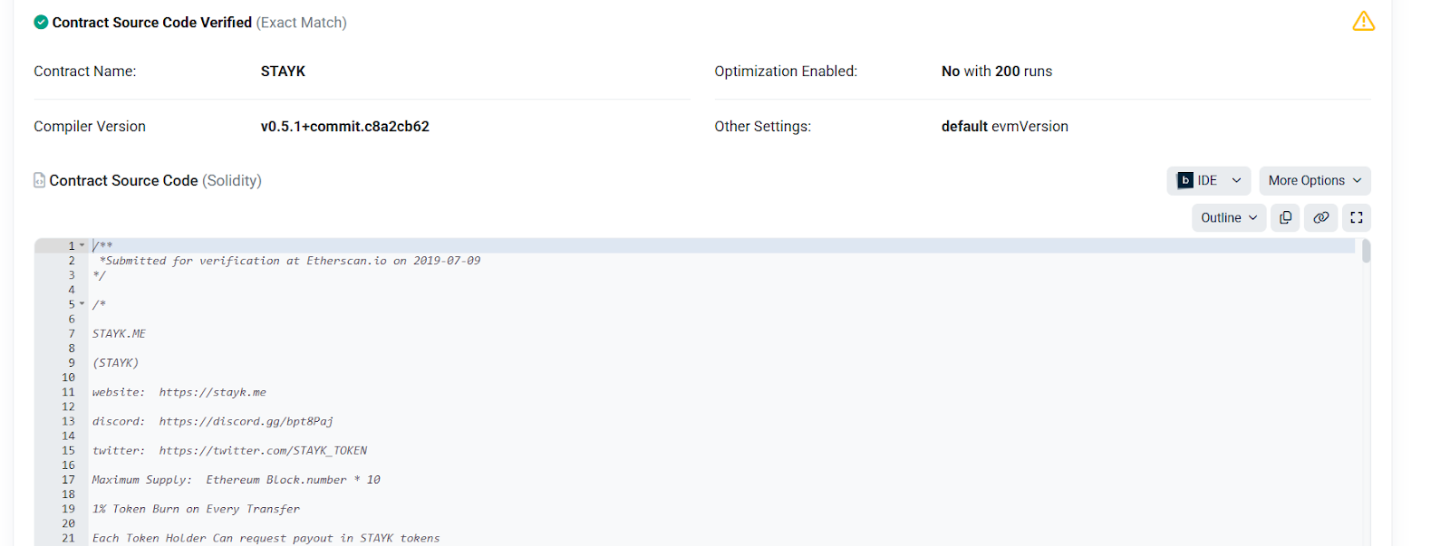 Анализ кода Stayk показал, что явных признаков скама в нем нет, но есть несколько особенностей, которые выглядят подозрительно. Например, разработчики могут менять цену, лимиты и другие важные параметры, что неприемлемо в 2025 году, хотя раньше 90% токенов имели такие показатели. Судя по информации с Etherscan io, последняя транзакция прошла в июне 2020 года, так что разработку уже можно назвать устаревшей, да и вообще неактуальной.