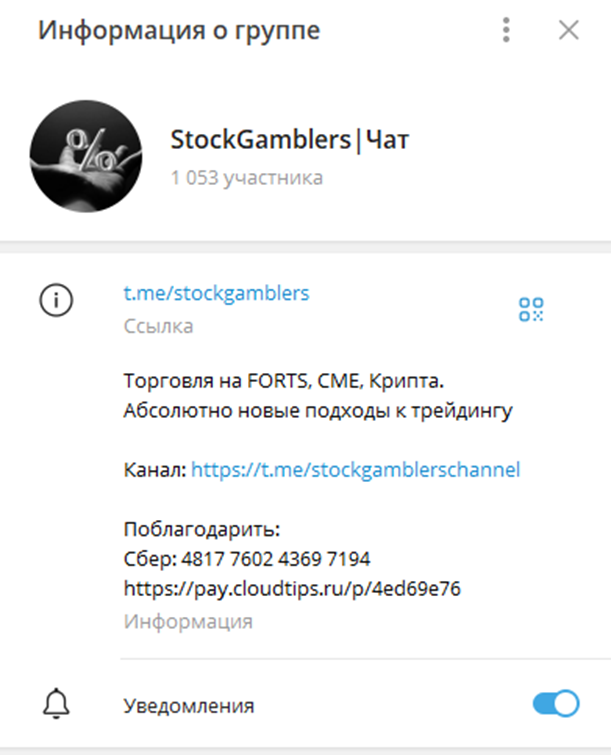 Кроме основного телеграмм-канала, также есть отдельный чат, под названием «StockGamblers чат». Тут подписчики могут обсуждать с автором и между собой, публикации основного канала. Для надежности, автор периодически дублирует их в чат.