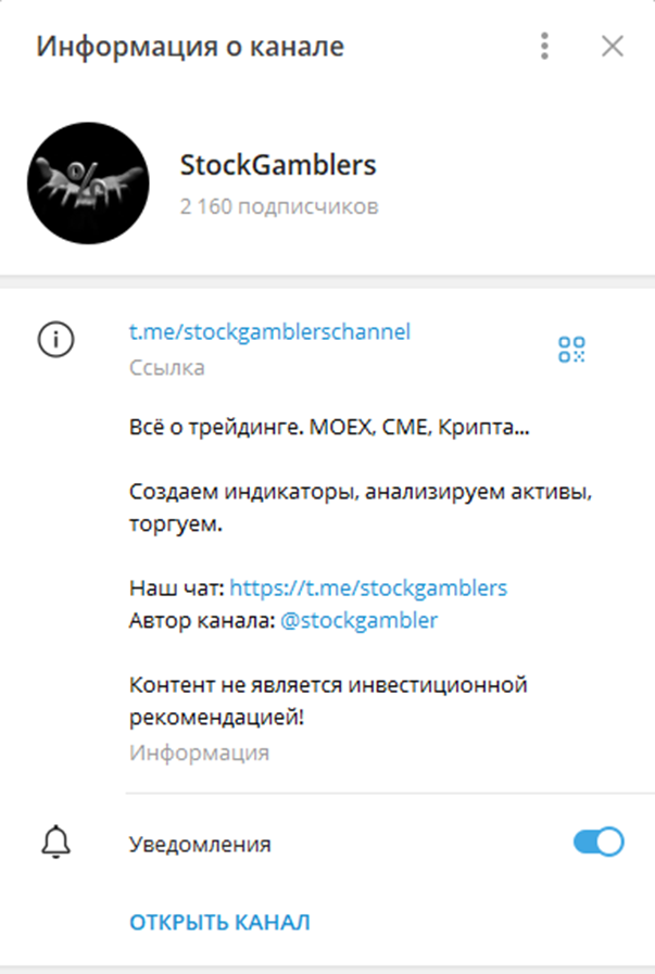 Торговые советы о том, как покупать и продавать активы в плюс представлены в виде скриншотов графиков. К ним идут пояснения от автора. По идее, это должно помочь трейдерам больше зарабатывать. На практике, публикации редко бывают полезны в процессе реального инвестирования. Найти канал в мессенджере, можно найти по ссылке stockgamblerschannel.