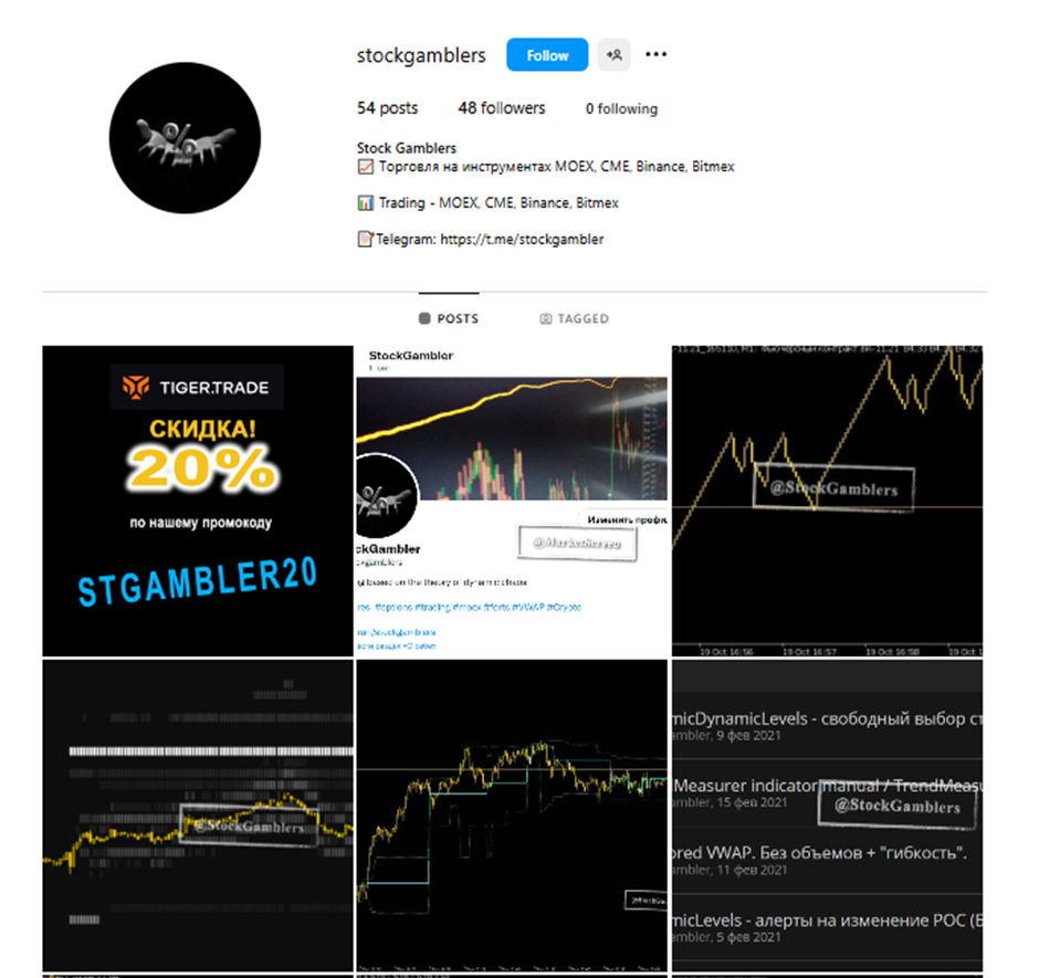 Также, у проекта есть собственная страница в Instagram. Однако на аккаунт Stockgamblers подписано всего 48 человек.