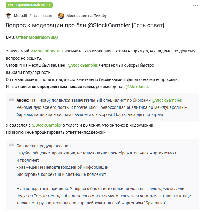 @AlexRadio был возмущен баном Stockgambler на ресурсе за грубое общение и публикацию неподтвержденной информации.