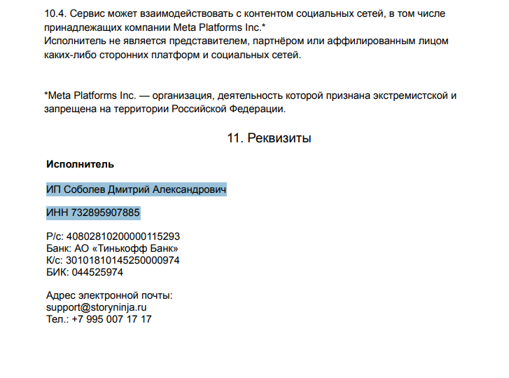 Также в договоре указан контактный телефон создателя бота и реквизиты ИП. За корректную работу программы несет ответственность конкретный человек, с подтвержденными юридически личными данными.