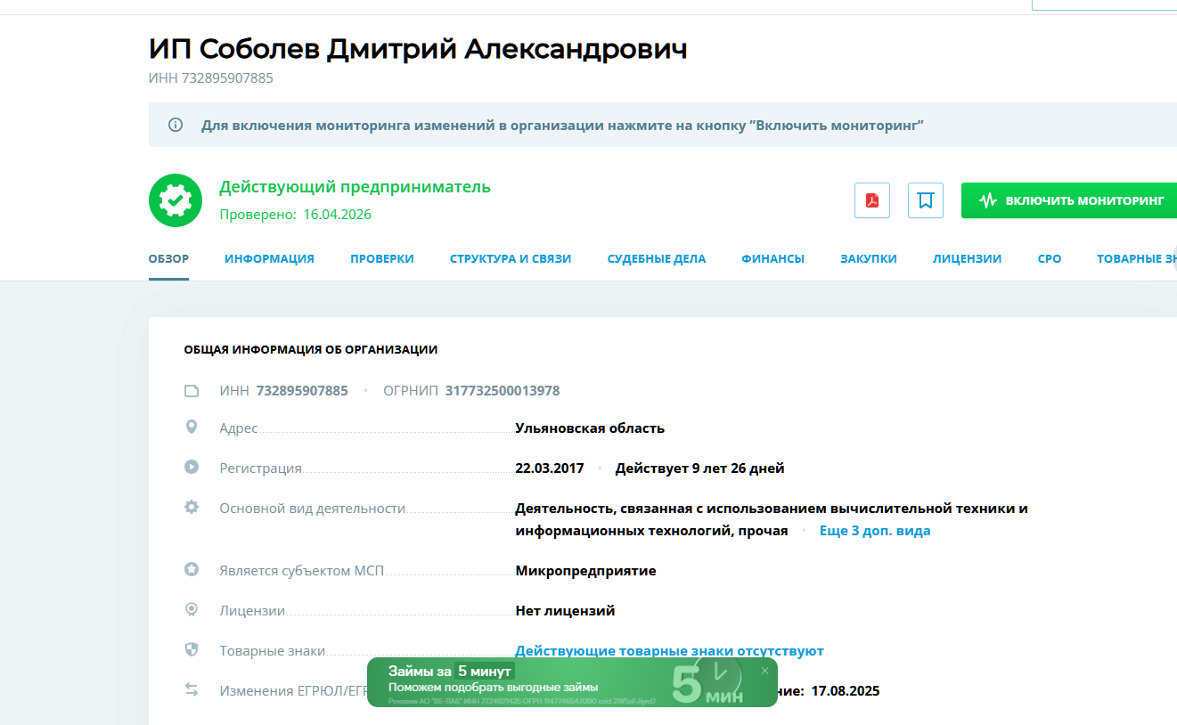 В договоре оферты указано, что оплата перечисляется разработчику программы ИП Соболев Дмитрий Александрович. Такой предприниматель существует, зарегистрирован в Ульяновской области, занимается программным обеспечением.