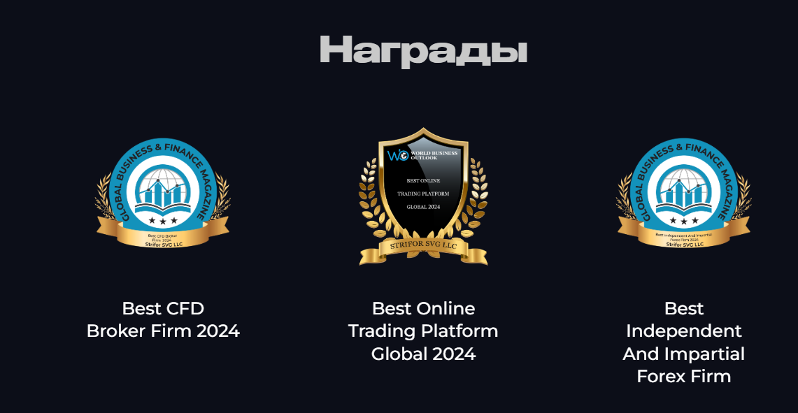 Владельцы проекта предлагают более 250 инструментов для торговли на рынках, куда входят Cfd, криптовалюты, сырье, индексы и акции, а также на сайте написано про минимальный депозит и кредитное плечо 1:500. На площадке Stri For зарегистрировано более 4 000 000 пользователей, а ежемесячный оборот превышает $3,500,000,000, причем в 2024 году проект получил несколько наград, в том числе и как лучшая платформа для трейдинга, хотя выданы они малоизвестными организациями.