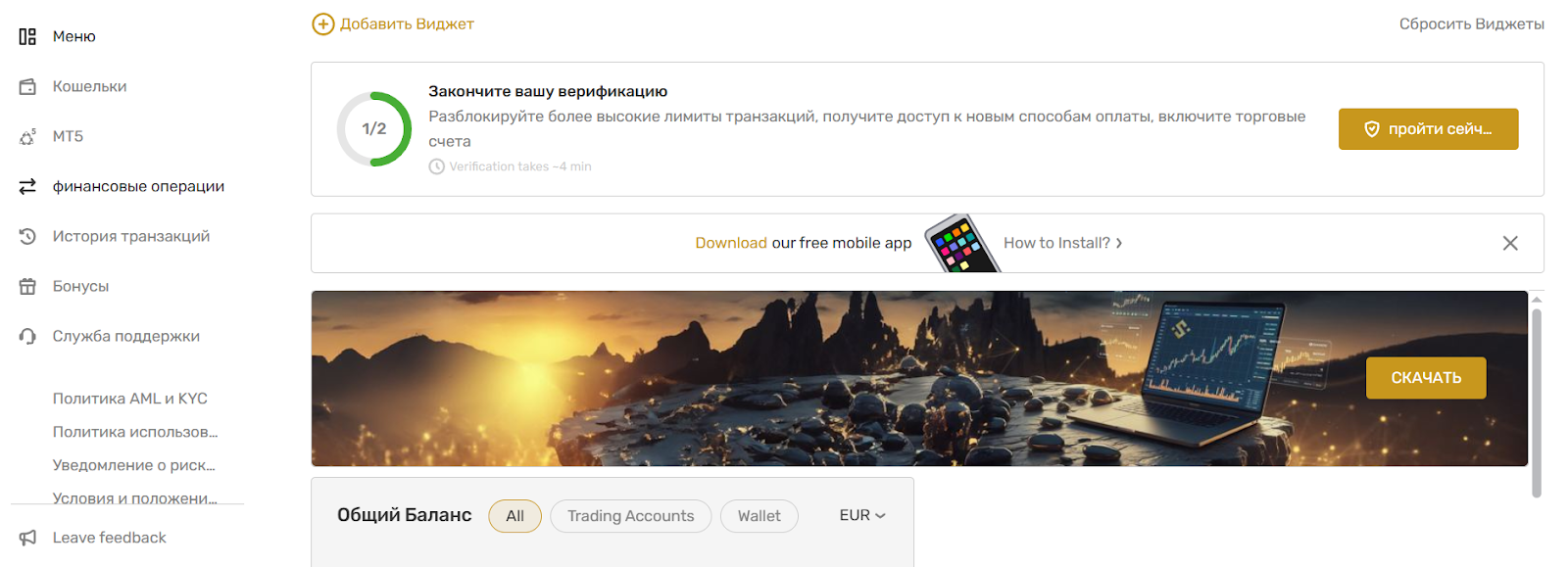 После создания счета дают ссылки на скачивание программы для разных устройств, а также на главную страницу в панели управления Stri For можно добавить различные виджеты. Есть раздел с бонусами, хотя во время проверки доступных не было, а также представлена возможность создать тикет для службы поддержки, но больше ничего в личном кабинете нет.