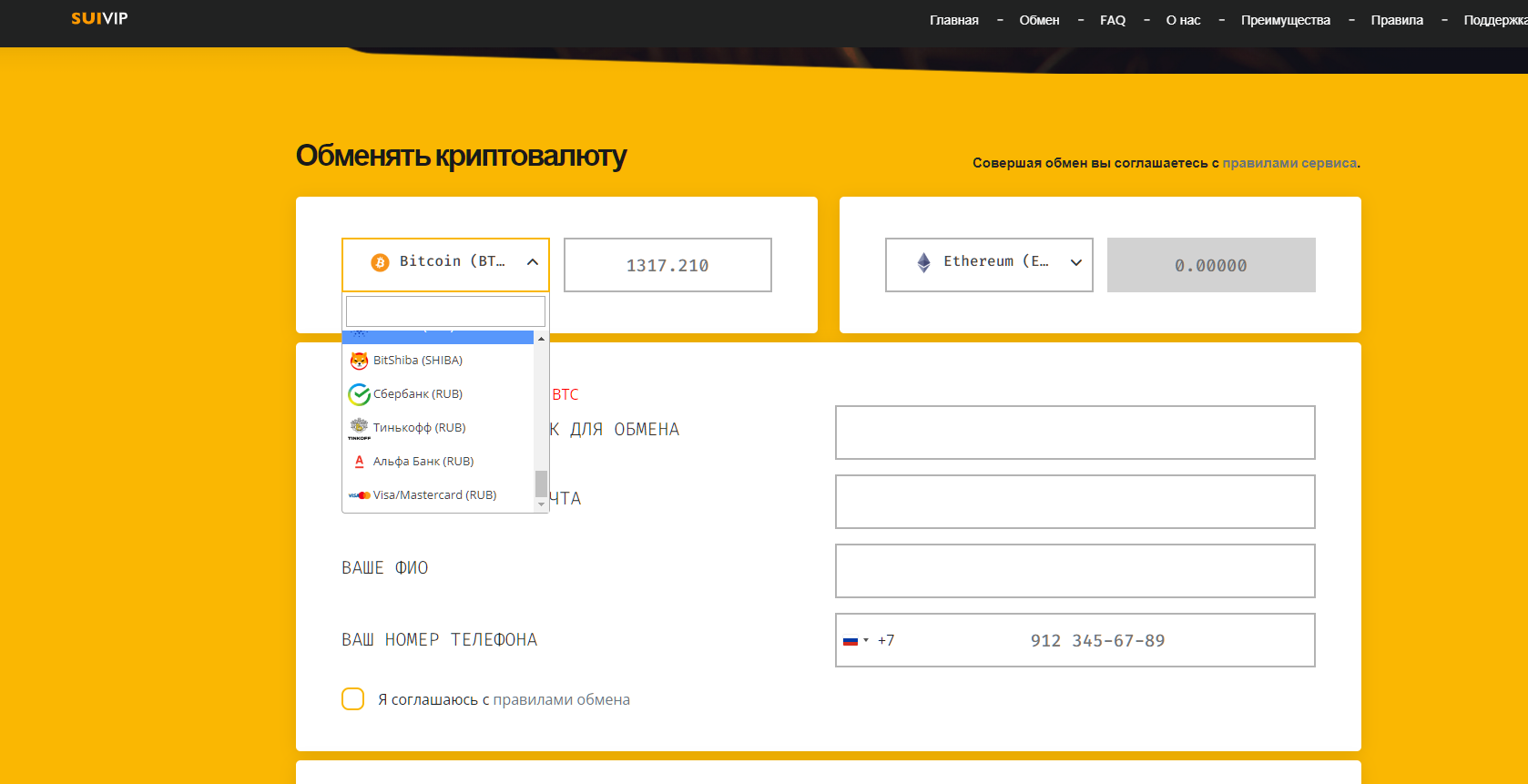 Условия обмена криптовалюты на скам сайте Suivip
