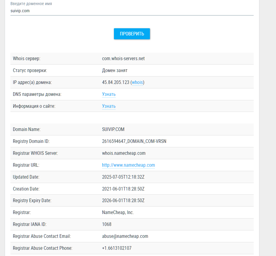 Проверка регистрации, данных домена сайта обменника suivip com