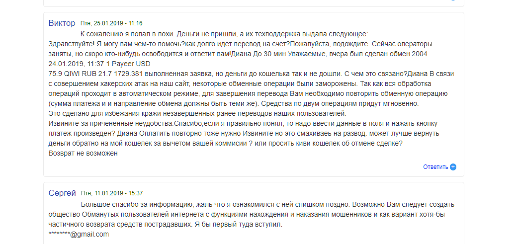 Сайты мониторинга и пользователи утверждают, что этот сервис по обмену валют принадлежит к группе фейковых сайтов имитаций. Платформа не совершает обмен, а просто отнимает деньги у доверчивых трейдеров.