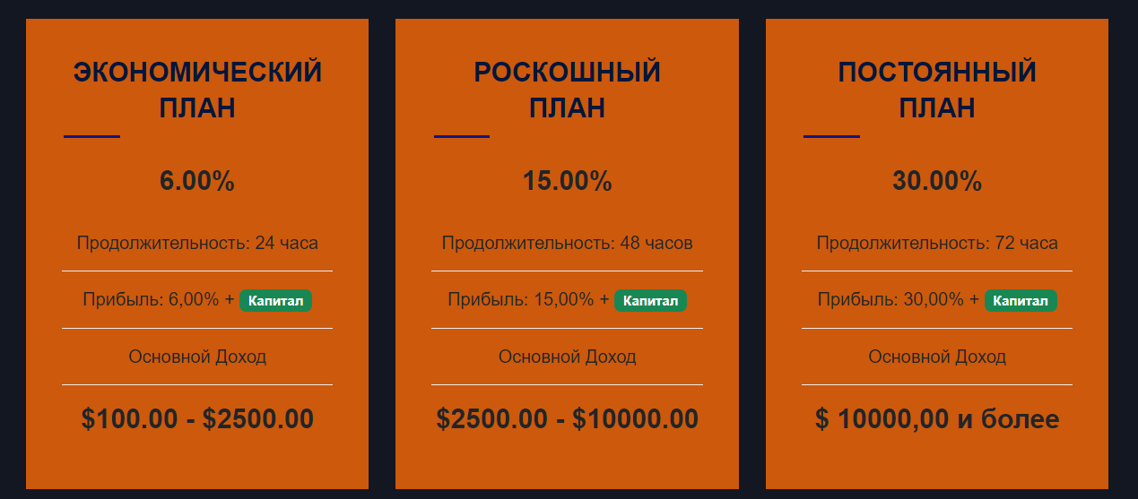 Минимальная сумма инвестиций в каждом плане разная и начинается от 100 долларов. При этом для вложений нет ограничений.