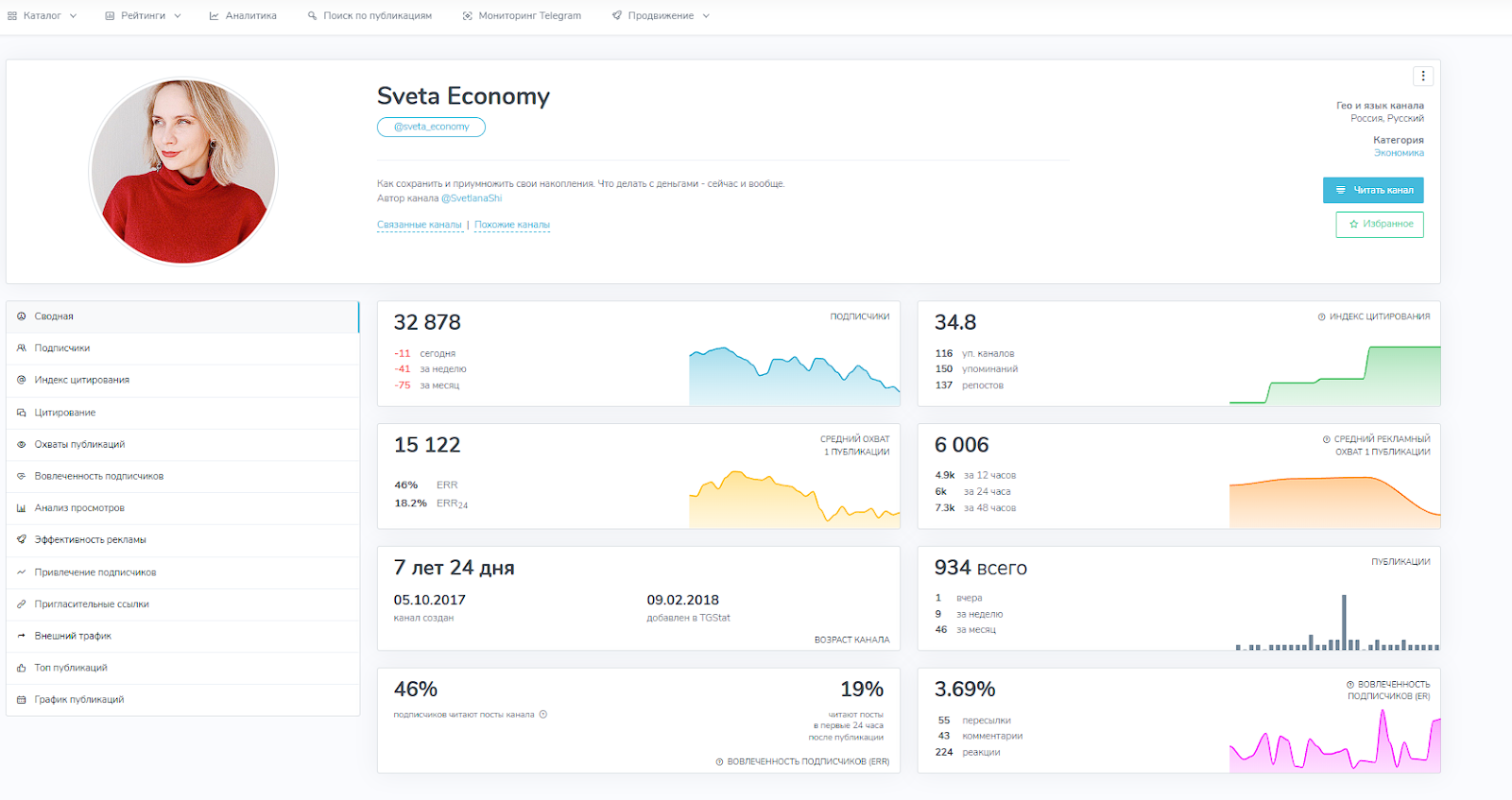 Телеграмм канала от Светланы Шишкиной существует на протяжении длительного времени и создан в 2017 году. За это время она собрала широкую базу подписчиков в количестве 32 тысяч человек. Из них примерно 50% активно следят за новыми публикациями, а средние охваты составляют 7 — 15 тысяч просмотров.Комментарии в канале открыты, но реакции ограничены. Можно заметить активное обсуждение тематических статей, которые SvetlanaShi публикует ежедневно. В основном контент делится на следующие типы: