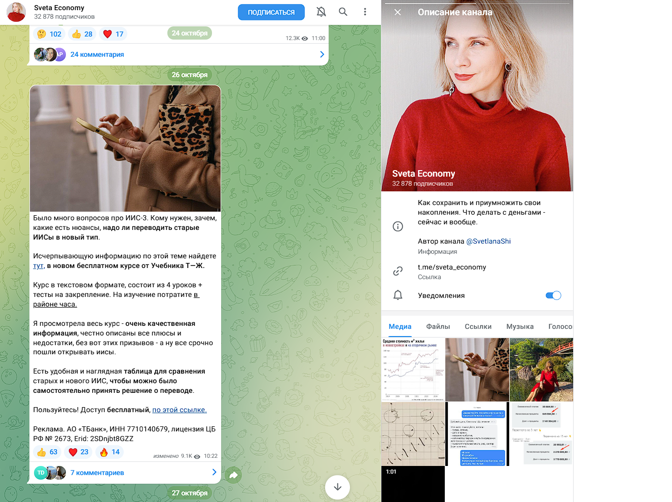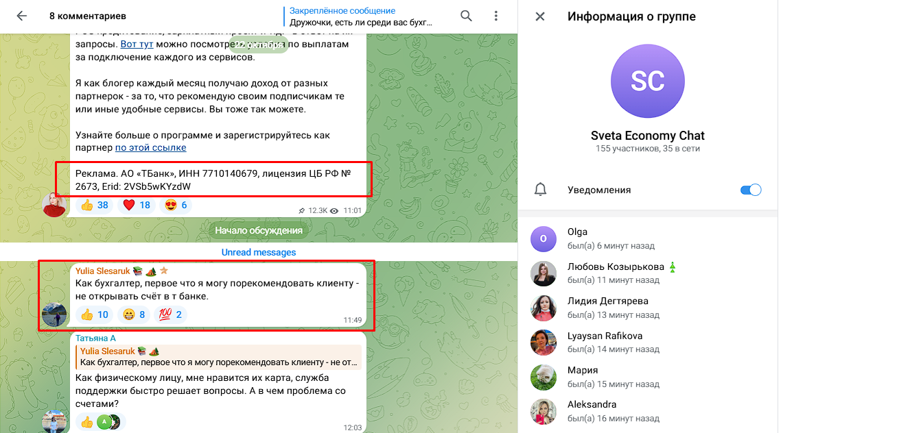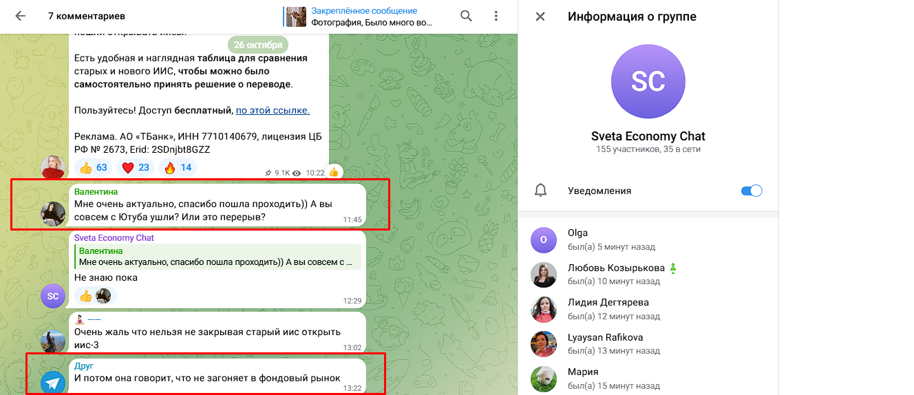 - реклама: Светлана не задумывается об информации которую размещает: различные фонды, брокеры, банки, в которые она предлагает вступить без подробной аналитики.