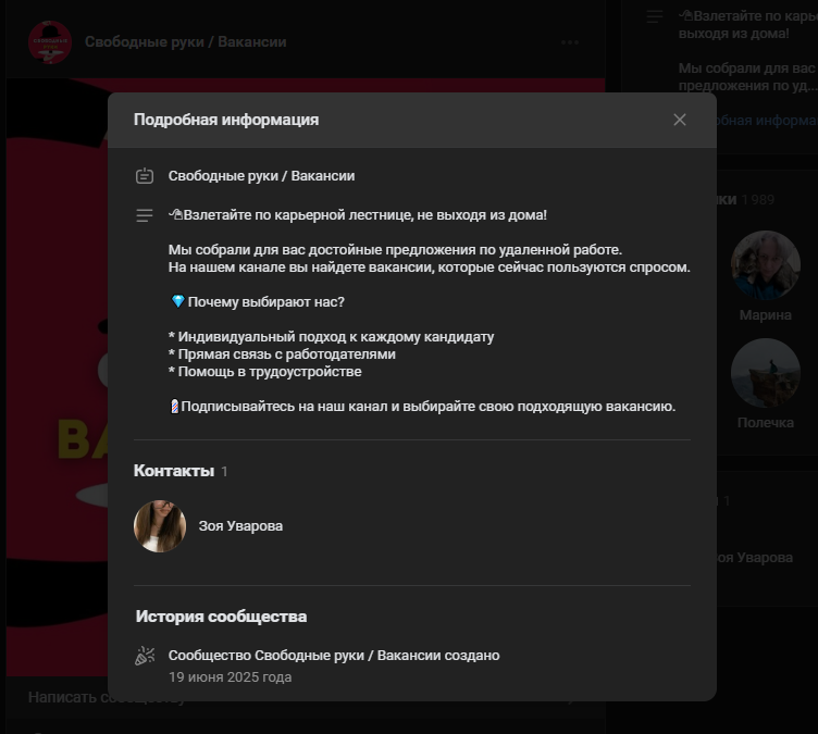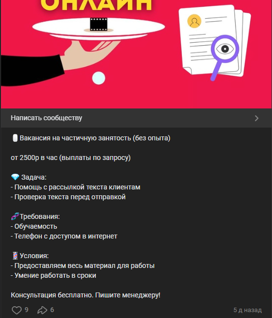 - в группе публикуются вакансии с завышенными ставками оплаты, что может указывать на мошенническую схему привлечения соискателей;