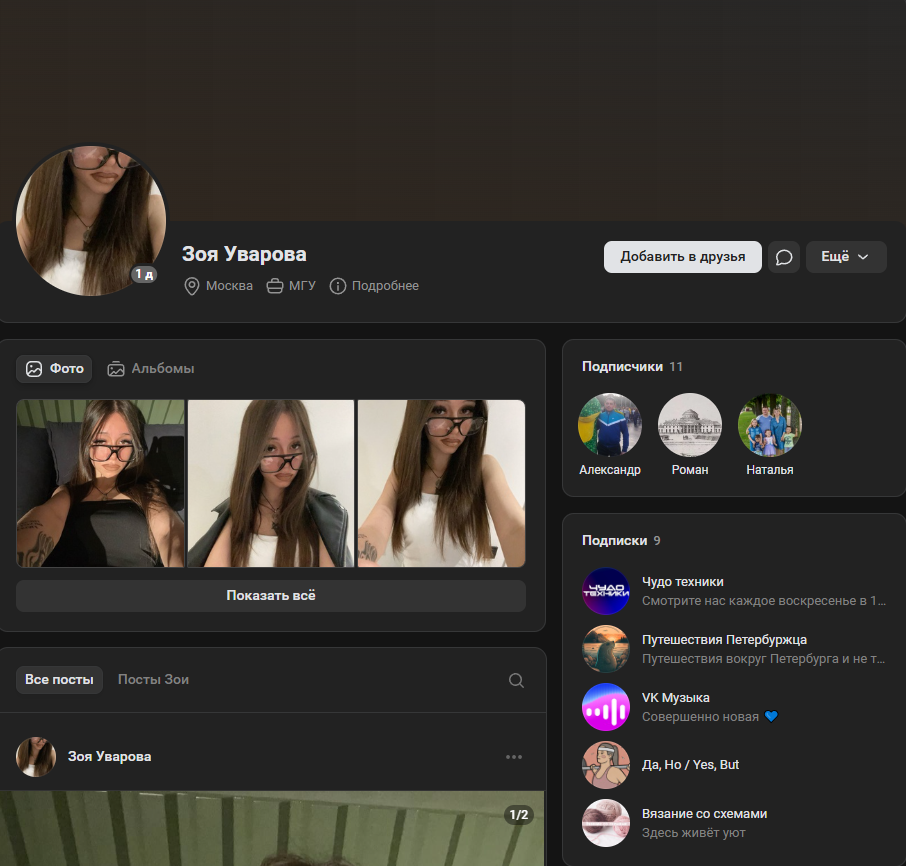 Указано, что Зоя учится в МГУ на курсе Инноватике, больше ничего.