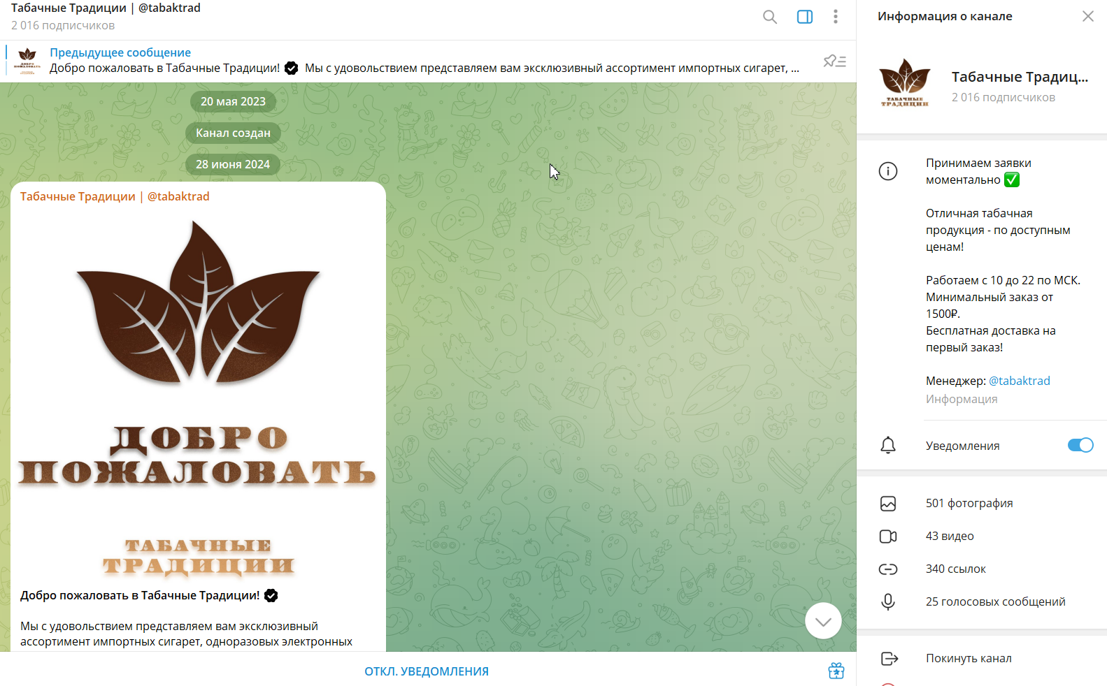 Профиль «Табачные традиции | TabakTrad» появился в Телеграм в мае 2023 года, но первый пост опубликован в июне 2024 года. Вероятно, аккаунт был выкуплен, но кому принадлежал раньше и какой цели служил – утверждать сложно.
