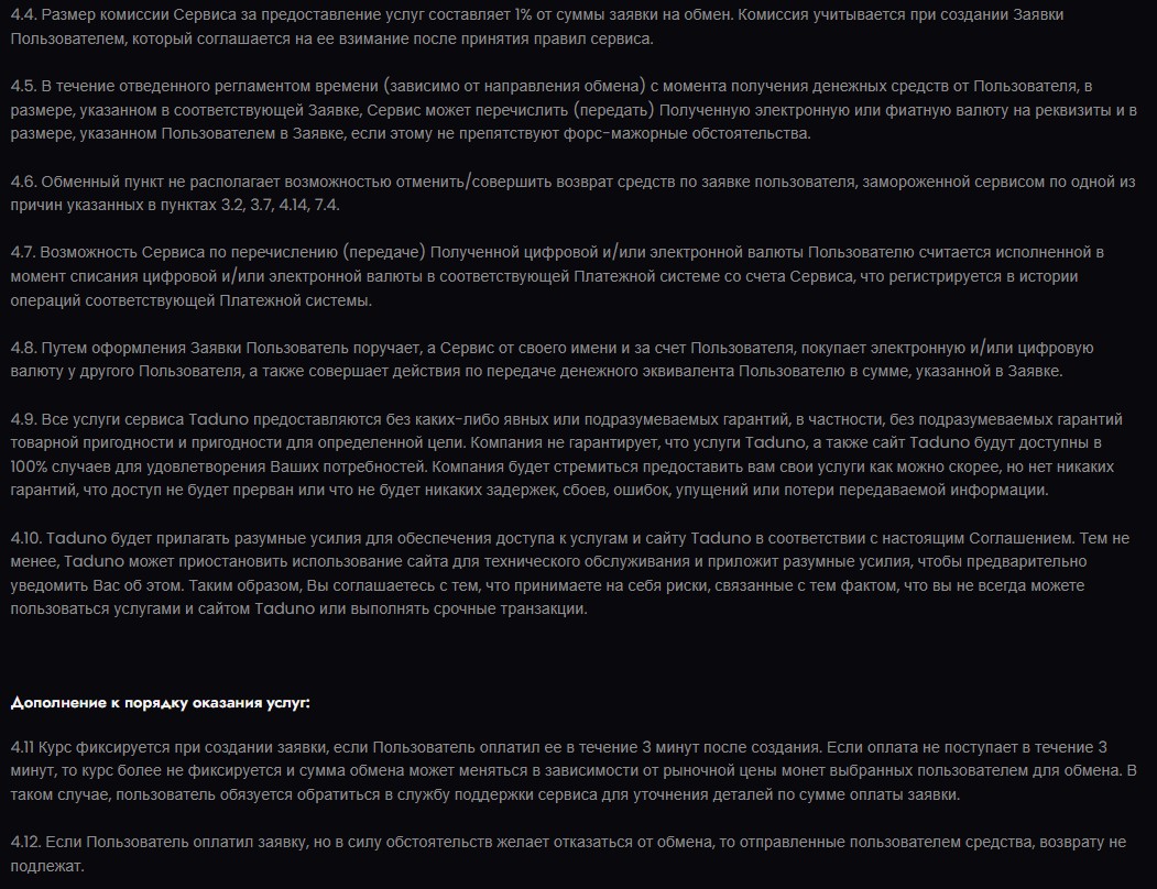 На сайте обменной площадки Taduno com не написано ничего об основателе или основателях сервиса,их профессиональном опыте, нет их имен, информации о наличии лицензии, так что проект можно назвать анонимным и стоит ли доверять ему свои деньги, неясно.