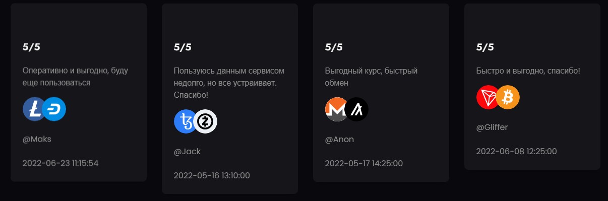 На сайте платформы есть раздел с отзывами, в котором опубликованы только позитивные отклики о работе с площадкой. В них сервис хвалят за выгодный курс обмена и отличную скорость операций, правда, отзывы короткие, однотипные и вполне могут быть фейковыми.