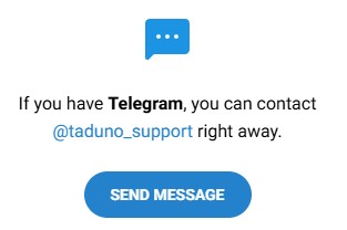 На сайте площадки нет раздела с контактами, нет почтового и электронного адреса, телефона, так что нельзя достоверно убедиться в том, что компания Taduno существует. Единственный способ связаться с менеджерами площадки — аккаунт в Телеграмм с ником taduno support.