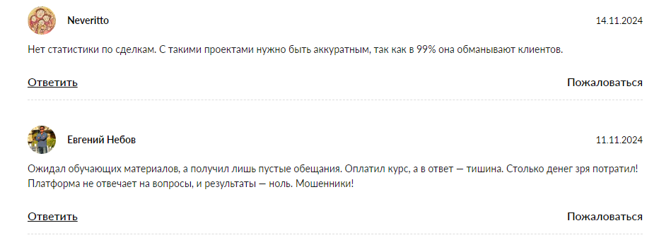 - Множество негативных отзывов. Люди говорят о том, что организация является мошеннической и регулярно скамит людей. Заработать с такой компанией не получится.
