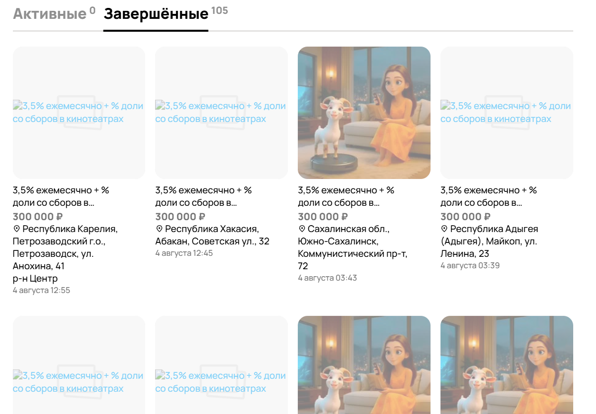 На «Авито» есть профиль Вадима, где он предлагает инвестировать в производство мультфильмов ₽300,000 под 3.5% ежемесячно плюс доли с кинотеатров.