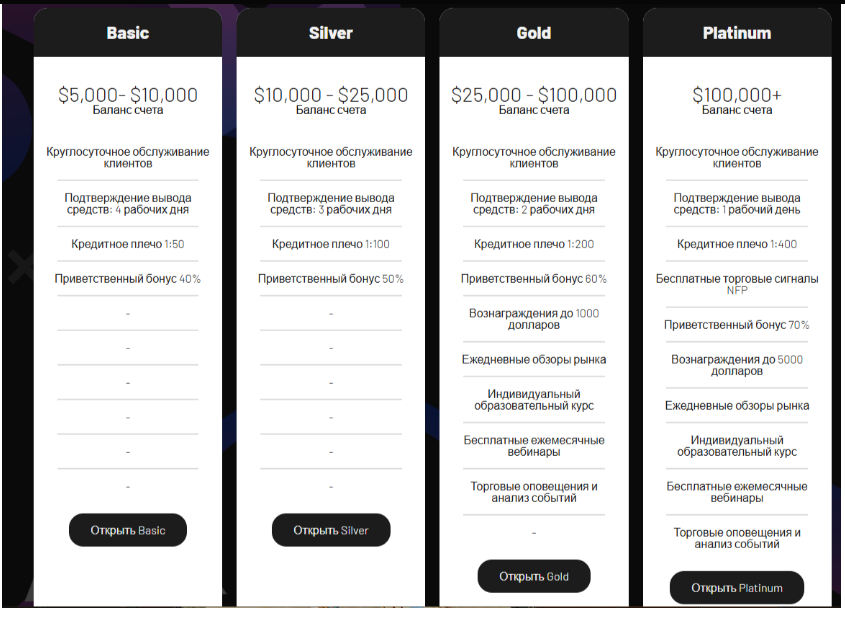 - Silver – от $10 000: поддержка 24/7, бонус 50%, плечо 1:100.