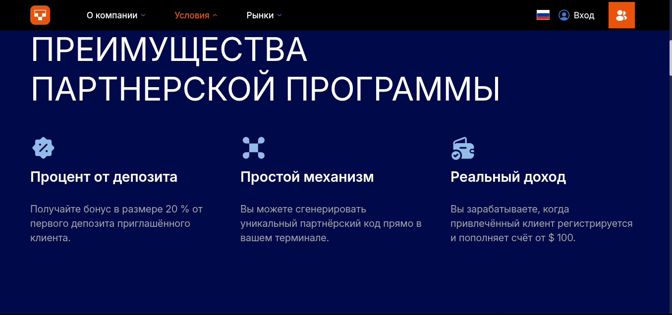 Для дополнительного заработка есть реферальная программа. За каждого привлеченного партнера трейдер получает 20% от его депозита. Вывести награды можно любым удобным способом.