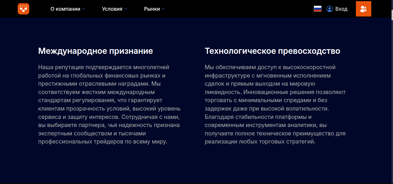 Разработчики инвестиционной платформы называют ее надежной и универсальной. На сайте менеджеры брокера пишут про международное признание, наличие отраслевых наград. Кроме того, финансовая компания якобы соответствует международным стандартам и имеет технологическое превосходство.