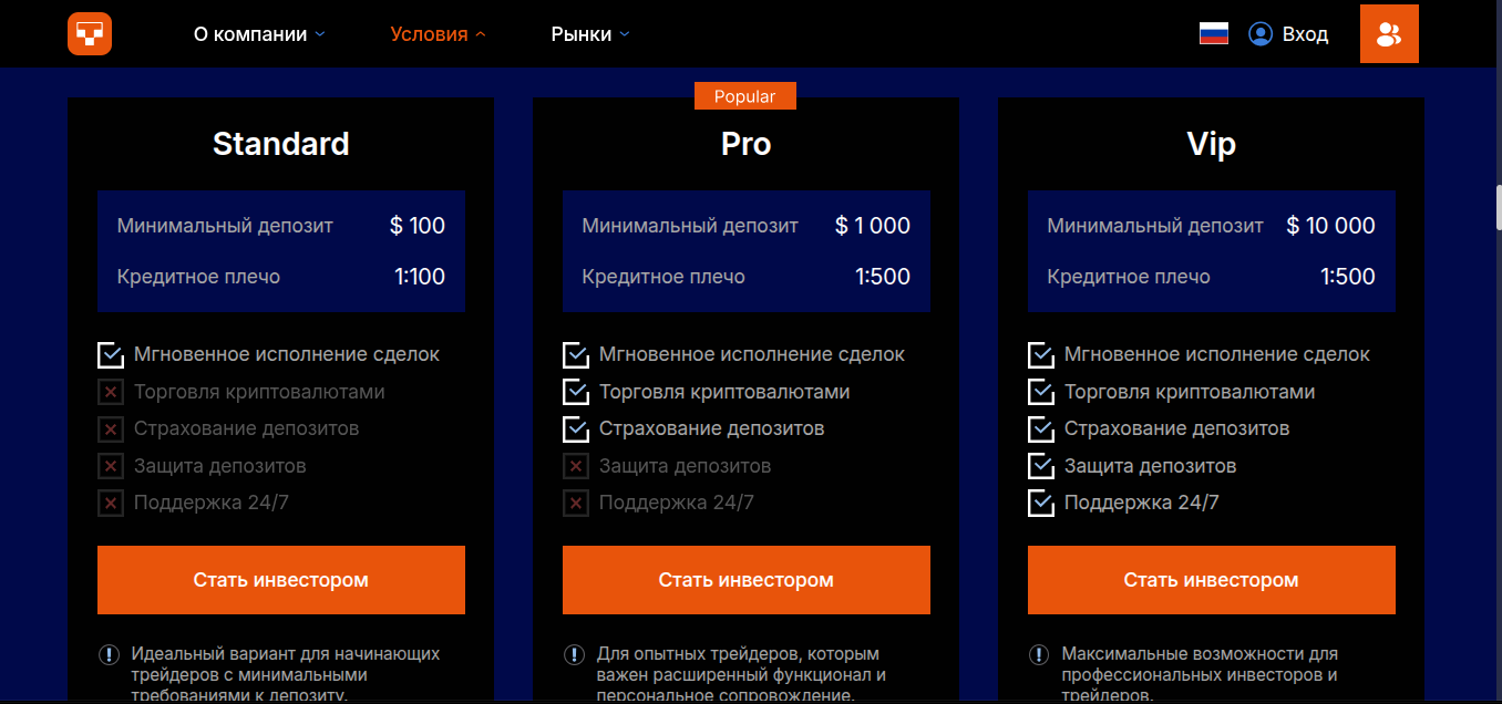 - PRO. Пополнение от 1000 долларов. Леверейдж — 1 к 500. Доступны страхование депозитов и торговля криптовалютами.