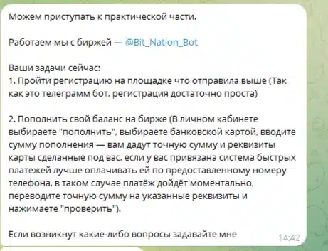 • схема работы — классическая раскрутка счета через сомнительный бот в Telegram.