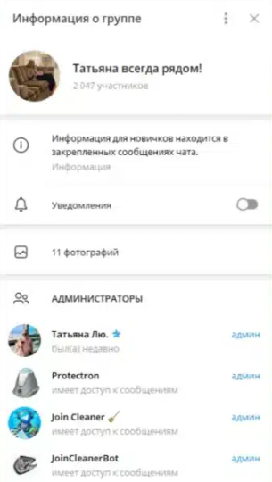 Татьяна всегда рядом ведет отдельный чат. Главный администратор — Татьяна Лю. Остальные контакты — типичные боты, которые помогают модерировать сообщения.
