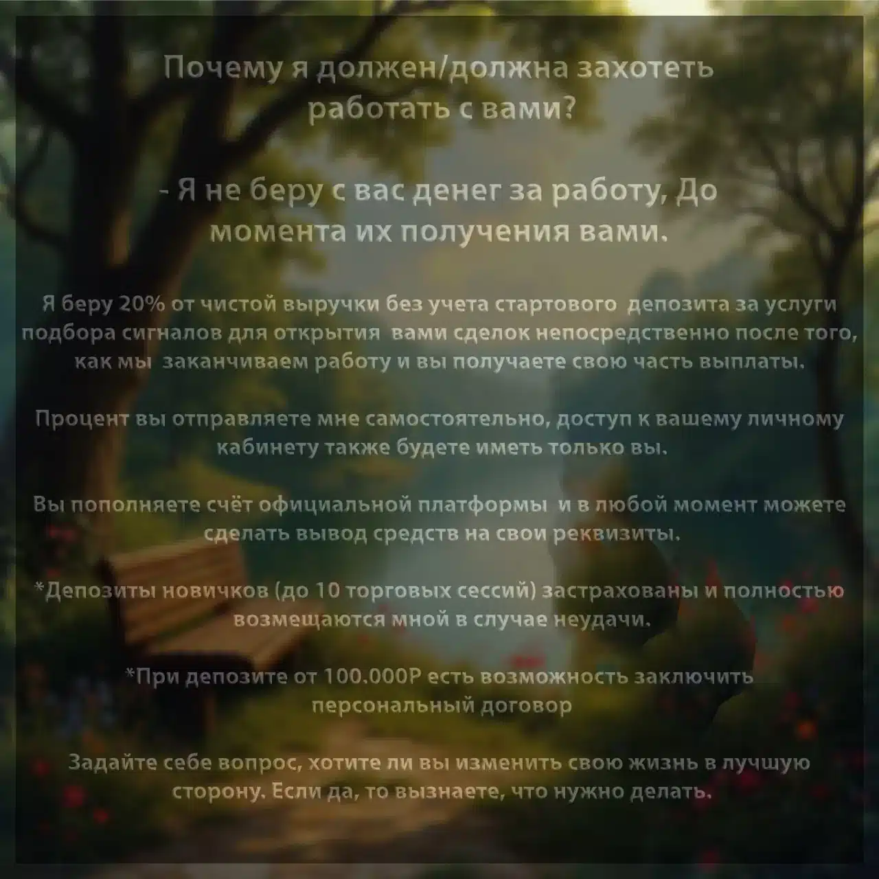 Татьяна Лю пишет, что деньги передаются «В доверительное управление», но по факту, она просто предлагает торговать по сигналам. Даже в этом моменте есть расхождение. И бот и сам проект выглядят очень подозрительно.